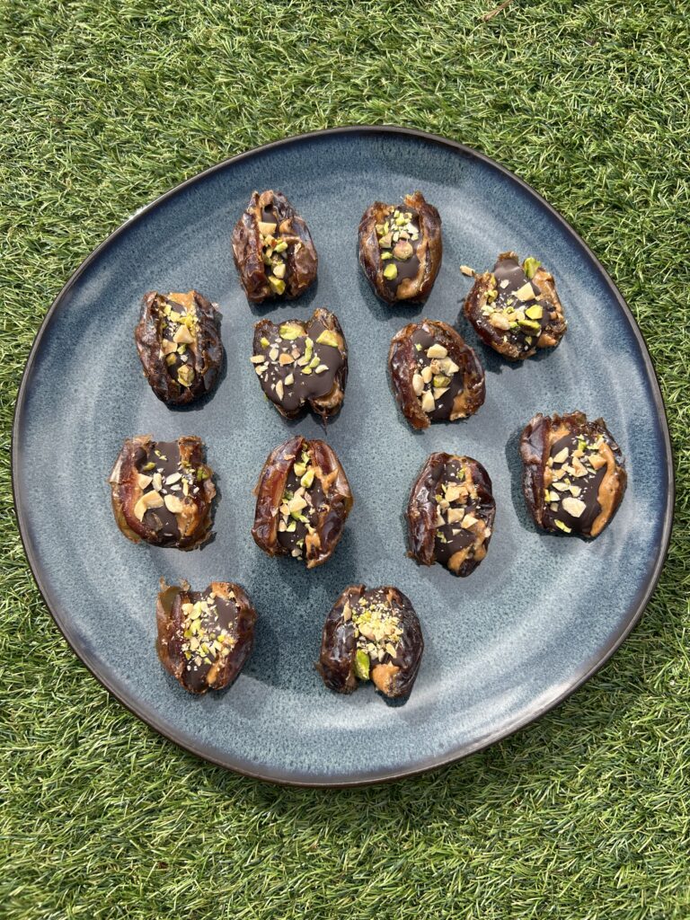 Dadels gevuld met pindakaas, pure chocolade en noten crunch